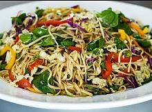 تفرم الخضار وتخلط معاً في وعاء، ثم تُضاف إلى النودلز
