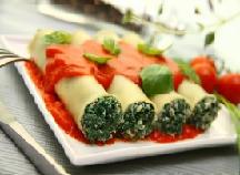 ضعي نصف مقدار الصلصة في صينية فرن، احشي الكانيلوني بخلطة السبانخ و رصيها في الصينية