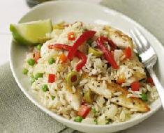 يغسل الأرز ويصفى ثم يضاف إلى الخليط السابق مع 4 كوب من مرقة الدجاج