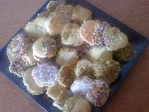 ومن ثم نغمس الأطراف بزينة الحلويات “الفرماسيل” وبرش جوز الهند والفستق الحلبي