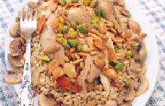 يسكب القمح في طبق التقديم ويزين بالمكسرات واللحم
