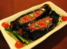 ثم اصنعي شق في الباذنجان وقومي بحشو الباذنجان باللحمة المفرومة