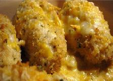 أحضري مقلاة أخري وسخني فيها المتبقي من الزبدة، ضعي صدور الدجاج في الزبدة ثم في البقسماط ومنها إلى صينية متوسطة الحجم