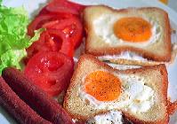 توضع شريحتا الخبز في المقلاة وتصب بيضة واحدة في المكان الفارغ في كل شريحة