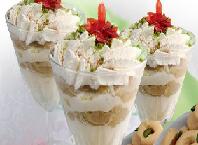 تحفظ الأكواب في الثلاجة لمدة 2 إلى 3 ساعات، ثم يزين سطح كل كوب بالكريمة الطازجة المخفوقة (باستعمال كيس حلويات مزود برأس زخرفي)، والفستق الحلبي المطحون وزهر الليمون