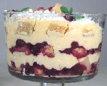 يقطع قالب الجاتوه الجاهز إلى قطع صغيرة ترصف طبقة من قطع الجاتوه في قعر وعاء الترايفل وتبسط فوقها ثلث صلصة التوت البري تقريباً
