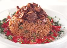 يوضع الأرز في طبق التقديم ويزين بمكعبات اللحم واللوز والصنوبر