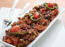 تخلط مكعبات الباذنجان المقلية مع قسم من الصلصة، تنقل السلطة إلى طبق التقديم وتسكب فوقها بقية الصلصة
