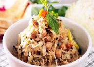 يفقش الحمص وينظف من قشره ثم يضاف إلى البصل ويقلى معه، يضاف الملفوف والدقيق ويحرك المزيج على نار متوسطة حتى يصبح الملفوف أصفر اللون