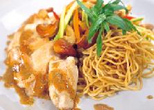ترصف المعكرونة في جهة واحدة من طبق التقديم، وتوضع قطع لحم الدجاج في الجهة الأخرى مع الخضار والصلصة