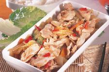 تضاف قطع الدجاج المقلية إلى الخضار ويطهى المزيج فوق نار قوية حتى تغلي الصلصة وتصبح كثيفة يتابع الطهو لمدة دقيقتين