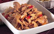 تقلى الخضار معاً حتى تنضج وإنما تبقى هشة، شرط تحريكها باستمرار، يضاف إليها لحم الدجاج ويسخن الكل معاً