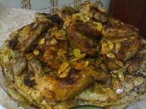 نقطع الدجاج إلى أنصاف أو يترك كاملا ويطبخ بالبهارات ويحمر بالفرن