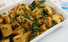 يحمى الزيت في مقلاة وتقلى فيه مكعبات البطاطا حتى تصبح ذهبية اللون