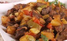 تدهن صينية خاصة بالفرن بالسمنة ثم توضع الخضار مع اللحم