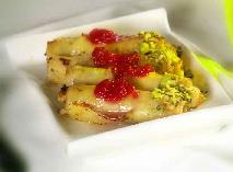يحمى الزيت ثم تقلى حتى الاحمرار ثم تخرج و توضع على ورق ماص للزيت عند التقديم تغمس في القطر و توضع في طبق التقديم و تزين بالفستق المطحون