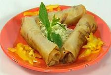 تمدد رقاقات العجين و يوضع بداخل كل واحدة 1 – 2 ملعقة من الحشوة ثم تلف و تلصق بخليط الماء و الطحين