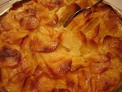 نخلط الحليب مع مرق الدجاج والماء ونصف مقدار الجبن المبشور ونتبله ونسكبه على الكل حتى تتغطى البطاطا كلها