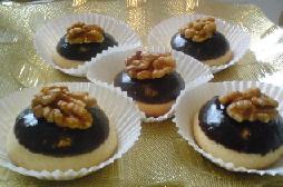 نشكل كرات بحجم حبة الجوز ، نخبز الكرات في فرن ساخن بعد الخبز نتركها تبرد ثم نذوب الشوكولا ونغمس نصف الحبة من فوق في الشوكولا الذائبة ونزين بنصف حبة جوز
