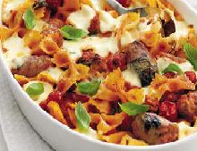 امزجي المعكرونة المطهية وخليط السجق والريحان