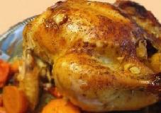 نخرج الدجاجة ونضعها في طبق التقديم ونضع الخضار حولها