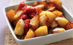 يطهى الخليط لمدة 15 دقيقة حتى تتحول البندورة إلى صلصة كثيفة، ترش التوابل وتقدم فوق البطاطا