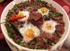 ضعي طاجين الفول بالبسطرما والبيض في الفرن لمدة 10 دقائق إلى أن ينضج البيض