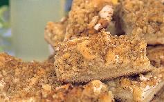 يبسط الميرانغ فوق العجينة، وتبرش كرة العجين المحفوظة جانباً بواسطة مبرشة الجبنة ينثر الجوز في الأعلى