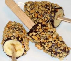 توضع قطعة الموز في البلاستيك ثم نقوم بغمسها في الشوكولا ثم في المكسرات