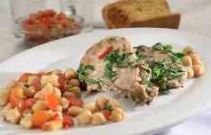 تقدم سلطة الحمص مع الدجاج وتوزع فوقها بقية صلصة الكزبرة والفليفلة