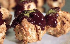 تغمس جهة من المعكرون في الشوكولا المذوبة ويرش القليل من الفستق الحلبي المطحون فوقها