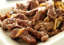 توضع شرائح اللحم في طبق التقديم، وتُقدم ساخنة مع الخبز أو المعكرونة