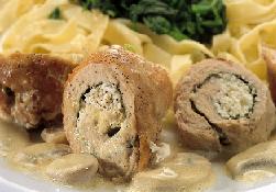 تلف شريحة الدجاج بورقتين من السبانخ وملعقة طعام من جبنة الماعز يلف الكل في شكل لفافة وتثبت بعود أسنان خشبي