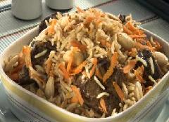 أضيفي الأرز و مزيد من الماء بحيث يغطي المرق الأرز بارتفاع 1 سم ، دعي القدر على نار قوية إلى أن يتشرب معظم المرق، ضعي قطع اللحم المسلوق فوق الأرز، غطي القدر بإحكام واتركيه على نار هادئة 30 دقيقة، ضعي الأرز في طبق التقديم، وزعي فوقه الزبيب و اللوز