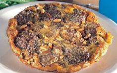 يوضع الفطر المقلي حول الأقراص، وكذلك الصنوبر المقلي يصب بعدها مزيج البيض حول الأقراص