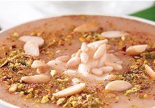 ثم يتم سكب المامونية في طبق التقديم ويتم رش القرفة على سطحها ثم يتم وضع فوقها الجبن وتزين بالفستق الحلبي