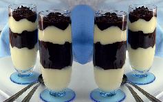 تحضر 5 أكواب طويلة، ويسكب فيها بالتناوب بودينغ الشوكولا وبودينغ الحليب مع الحرص على عدم مزج النوعين مع بعضهما