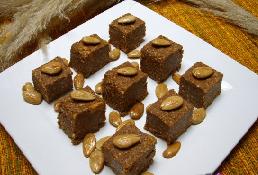 ضعي العجين المتماسك المحصل عليه في إناء مستطيل اضغطي جيدا على سطح الإناء ثم قطعي إلى مربعات وزيني وسطها بحبات اللوز الذهبي اللون ثم قدميه