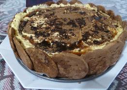 نضع طبقة من الكريمة ومن ثم طبقة من البسكويت المغمس بالقهوة والكاكاو البودرة نكرر هذه العملية إلى أن تكون طبقتين أو ثلاث طبقات من البسكويت والكريمة