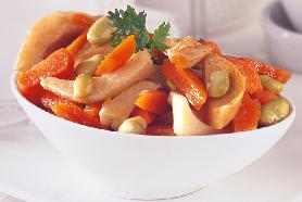تغطى القدر ويتابع الطهو حتى تنضج الخضار تماماً. تنقل بعدها الخضار إلى طبق التقديم ويحتفظ بالصلصة جانباً حتى تبرد