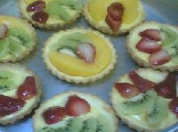 يُحشى بالكسترد ويُزين بالفواكه (كيوي + فراولة) يمكن استخدام أنوع أخرى من الفواكه المعلبة أو الطازجة) ثم طلي الفواكه بالجيلاتين + الماء المغلي)