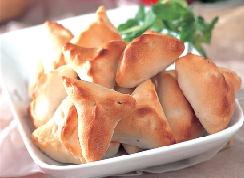 توضع ملعقة صغيرة من الحشوة في كل دائرة عجين قبل طيها على شكل مثلث