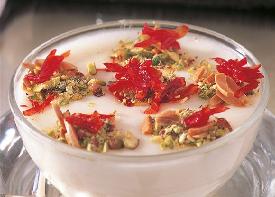 تسكب الحلاوة في أطباق الكاسترد وتزين بزهر الليمون والفستق. تقدم الحلاوة ساخنة