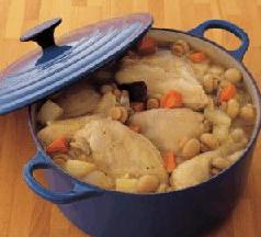 تُضاف مكعّبات الجزر والبطاطا والبصل الصغير والفطر والفلفل الأسود تُترك المكوّنات على نارٍ خفيفةٍ لمدّة 20 دقيقةٍ إضافيّةٍ أو إلى أن ينضج الدجاج والخضار جيّداً