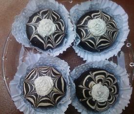 بعد الطهي نلصق حبتين مع بعض بالكريمة و تغلفها بالشوكولا السوداء و تزين بالشوكولا البيضاء و توضع وسطها وردة من عجينة اللوز