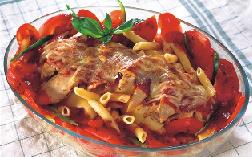 ترصف قطع البندورة حول المعكرونة وتوزع فوقها قطع الدجاج