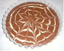 في حمام ماري نذوب الشوكولا السوداء ثم نضيف الكريمة نمزج الكل ثم نضعه كطبقة ثالثة ونزين بالشوكولا البيضاء نستعمل خط حلزوني ثم نجر بعود الأسنان من الداخل إلى الخارج لإعطاء الشكل