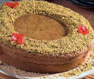 ضعي طبق صغير على سطح الكيك في الوسط. وزعي الفستق على المنطقة المحيطة بالطبق، ابعدي الطبق ، فتحصلي على شكل دائري