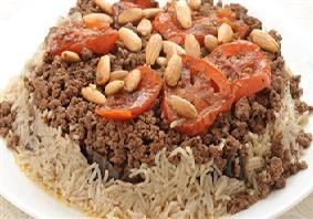 في قدر توضع دوائر البندورة ثم اللحم المقلي ثم الباذنجان والأرز