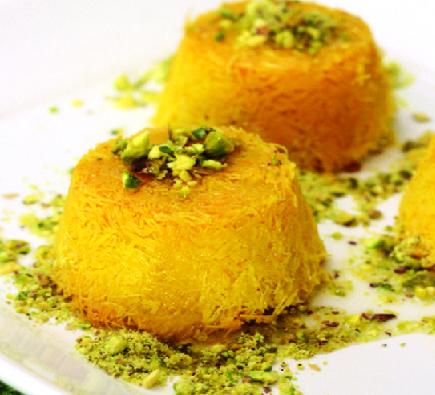 اقلبي الكنافة من القوالب برفق وقدميها مع القطر والفستق الحلبي المطحون
